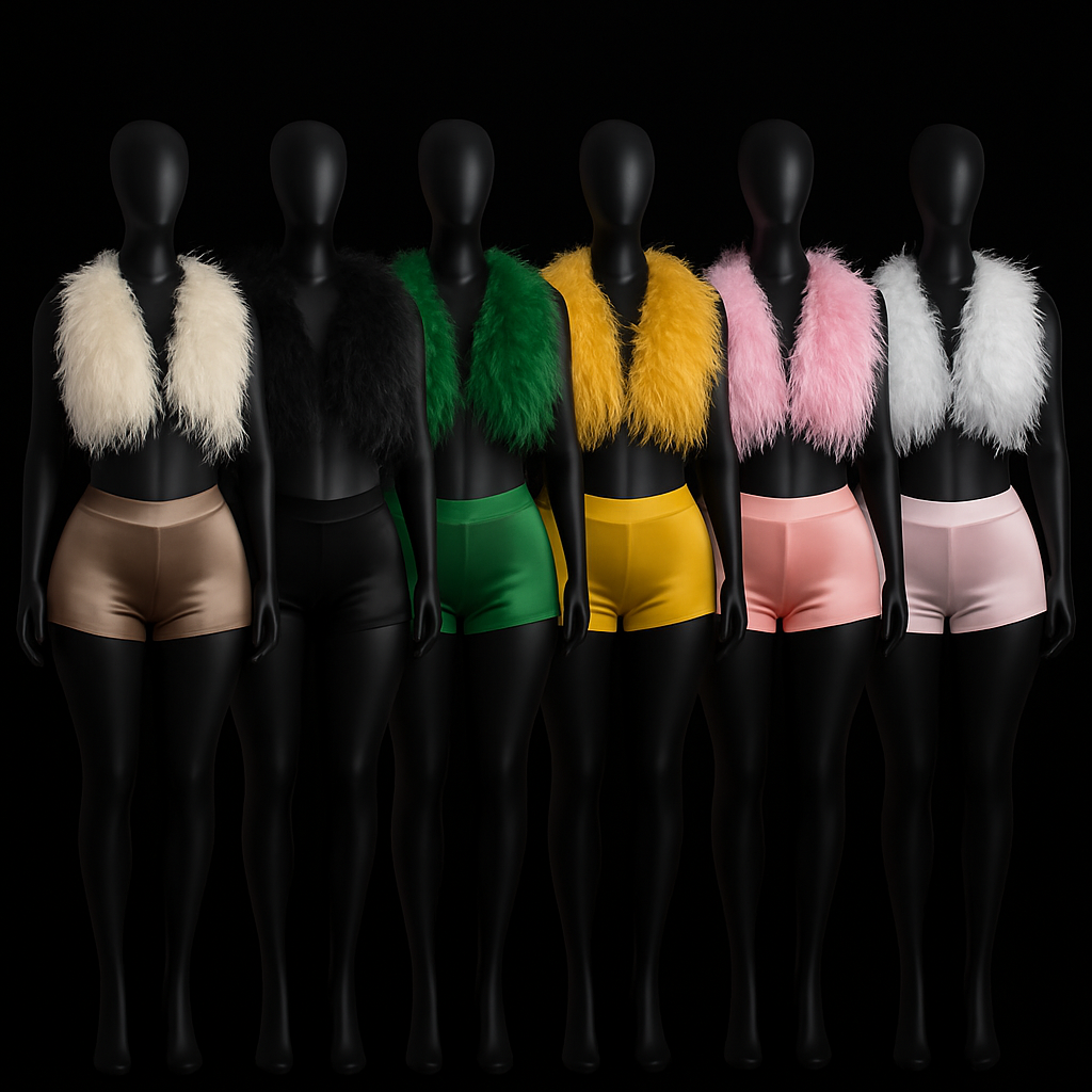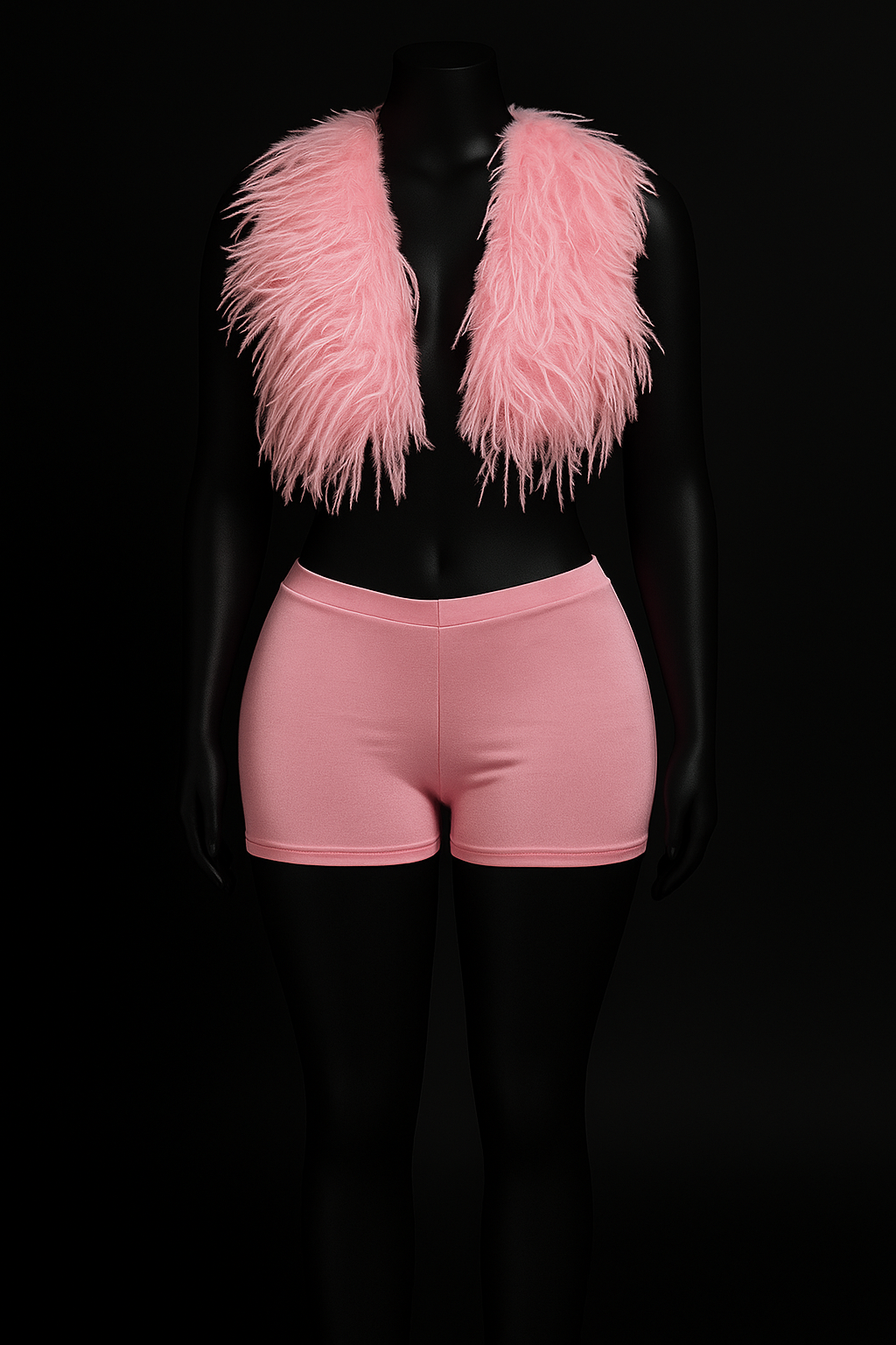 This two-piece statement set features a deep V feathered crop top paired with curve-hugging satin stretch shorts. Whether you’re lounging like a boss or stepping out with soft drama, this outfit turns heads without saying a word. Light, luxe, and made to serve body.